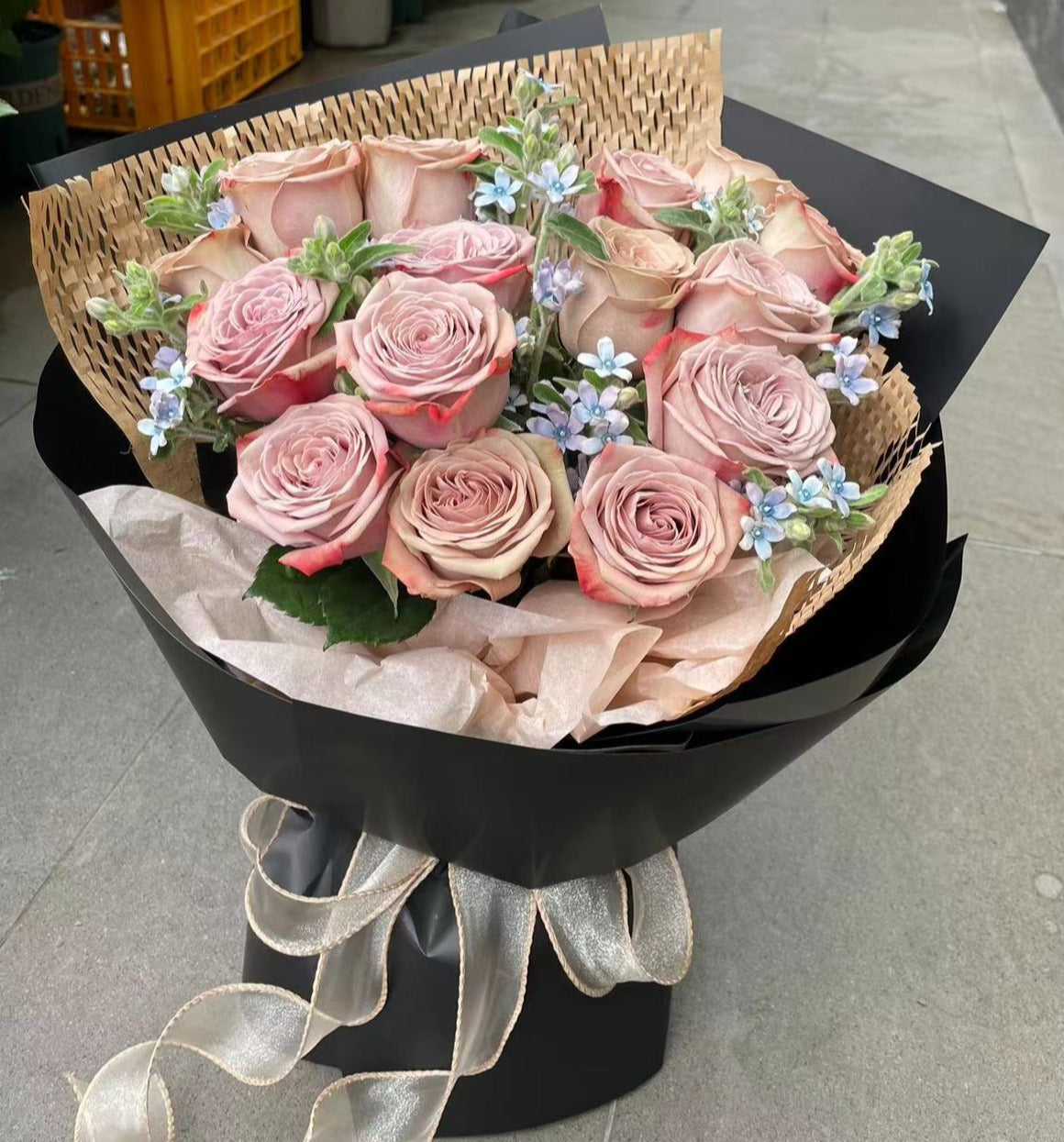 Indulge in the romantic beauty of the FTG 06 bouquet. Featuring dusty purple roses and assorted flowers, this arrangement will add a touch of elegance and passion to any space. Enjoy the luxury of fresh flowers and surprise your loved ones with a gift they will never forget.